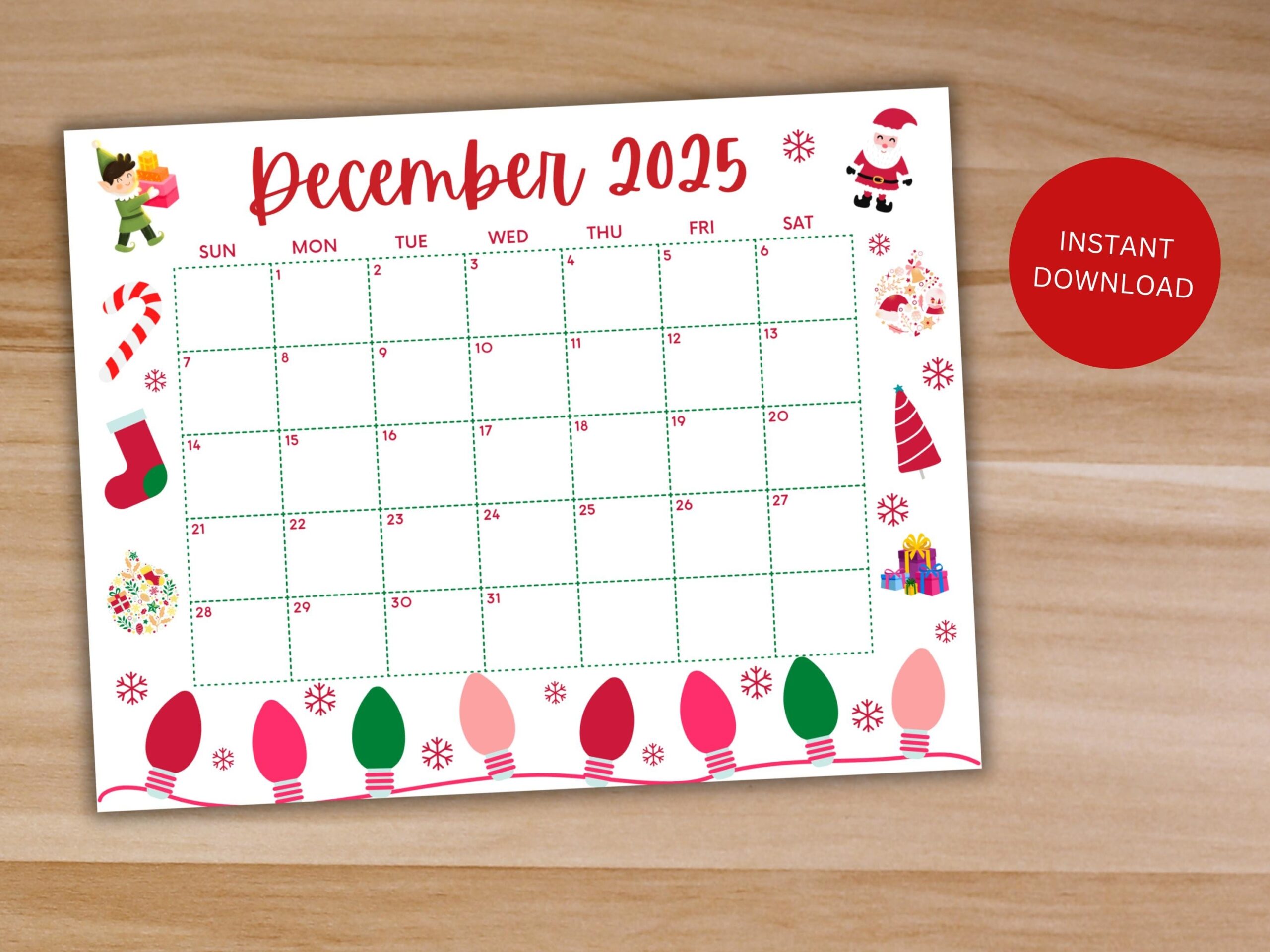 Printable December Calendar 2025 Christmas Calendar Holiday Calendar December 2025 Printable Calendar Family Calendar Printable Digital