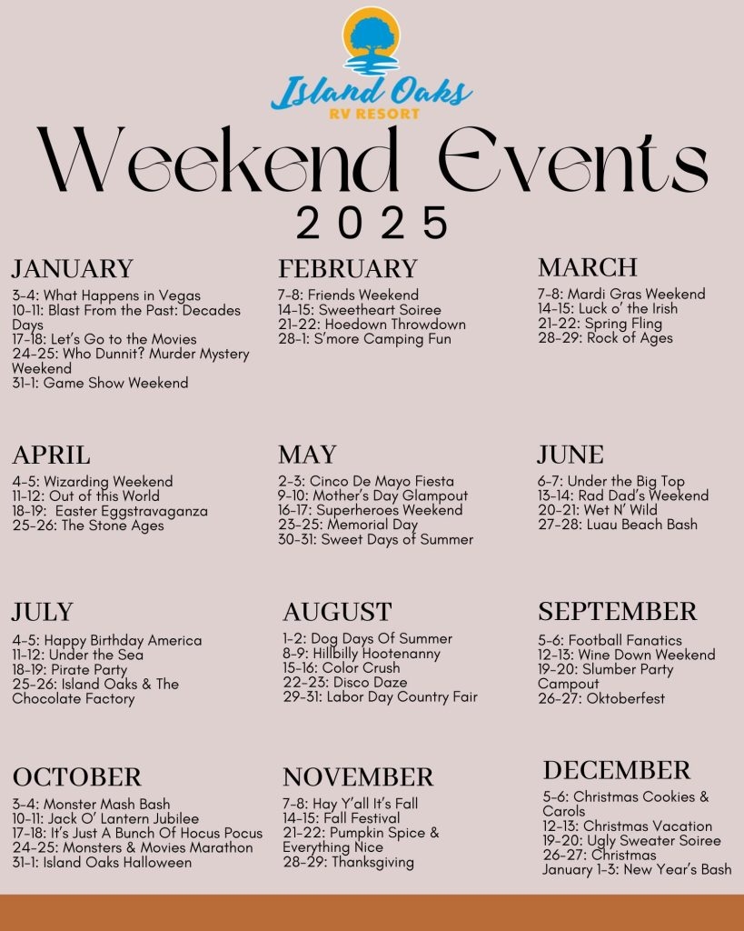 2025 Weekend Events Calendar Island Oaks RV Resort