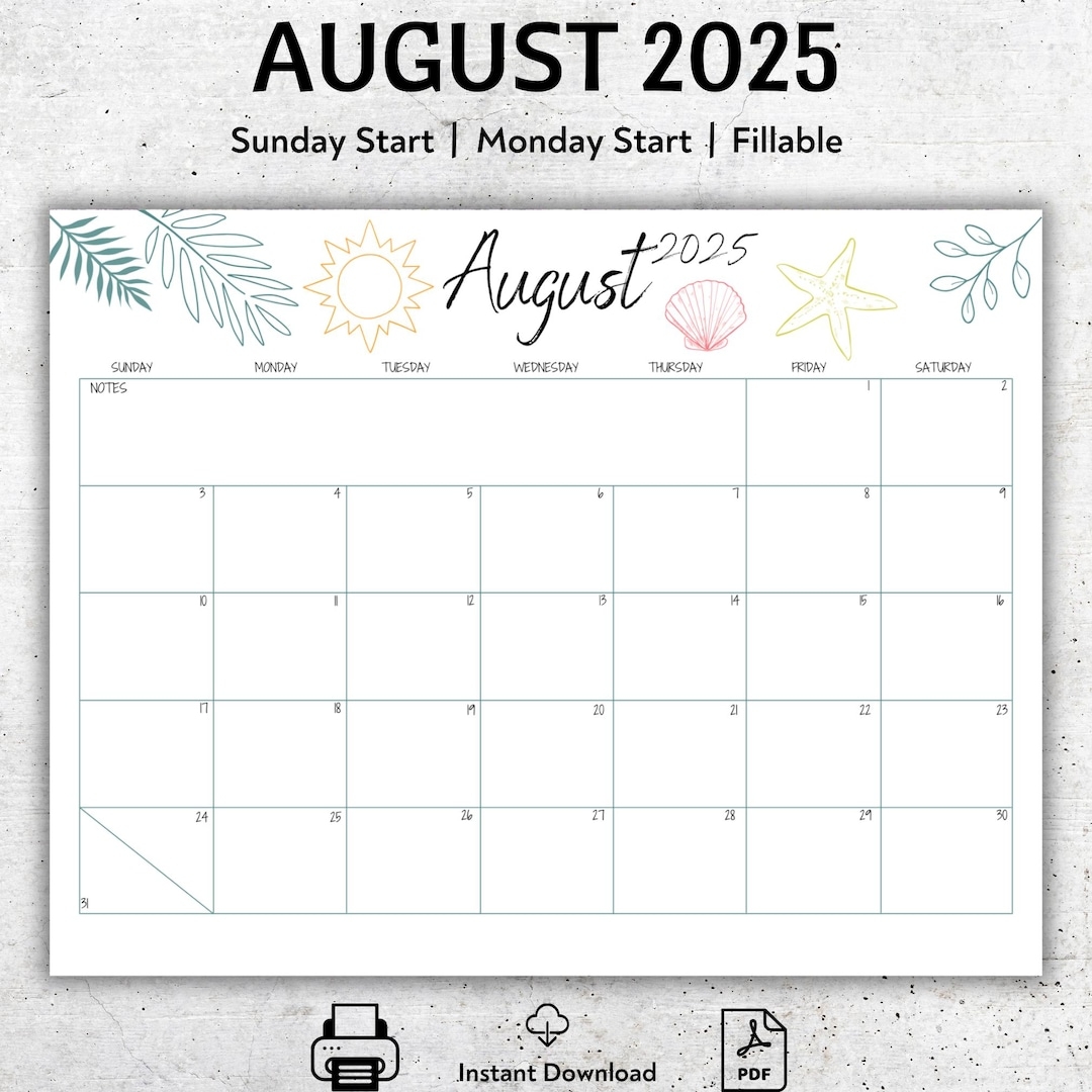 August 2025 Calendar Printable Minimalist Beach Design Editable