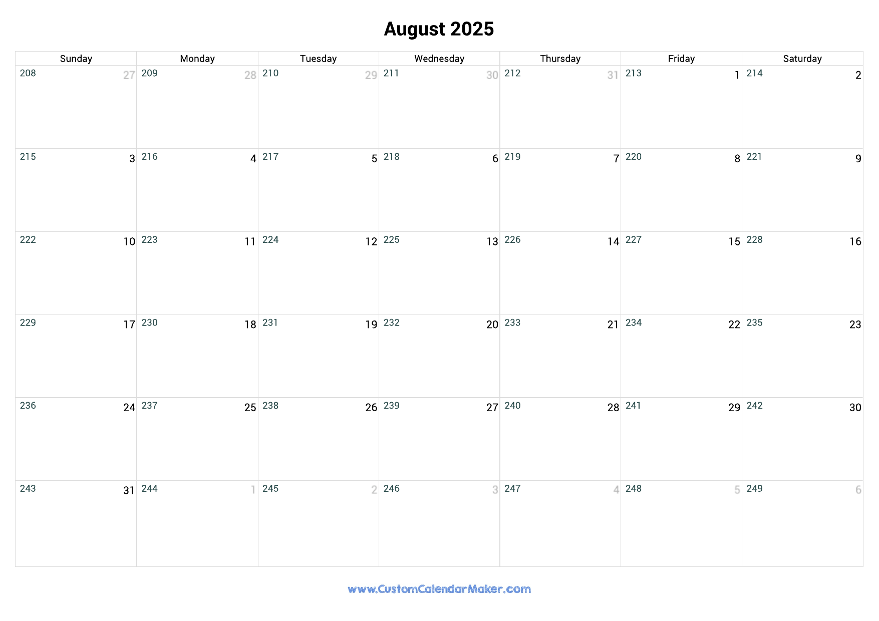 August 2025 Day Number Of The Year Calendar Custom Calendar Maker