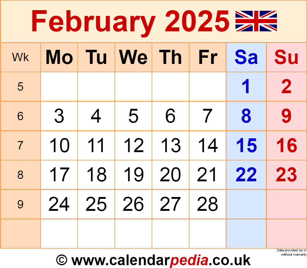 Calendar February 2025 UK With PDF Excel And Word Templates