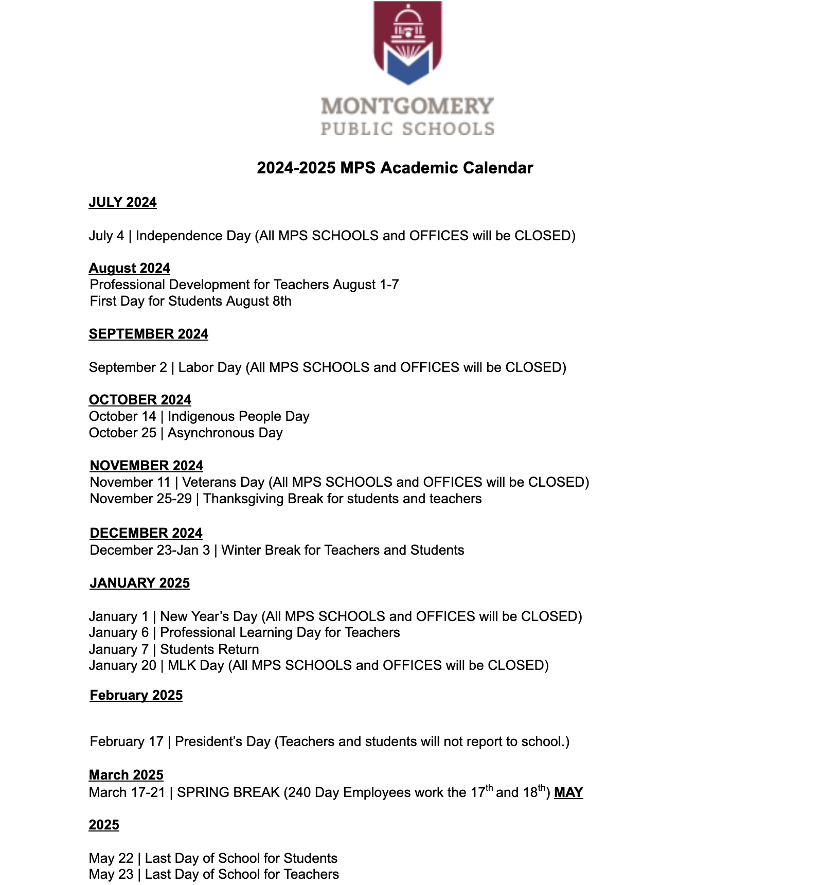 August School Calendar 2025