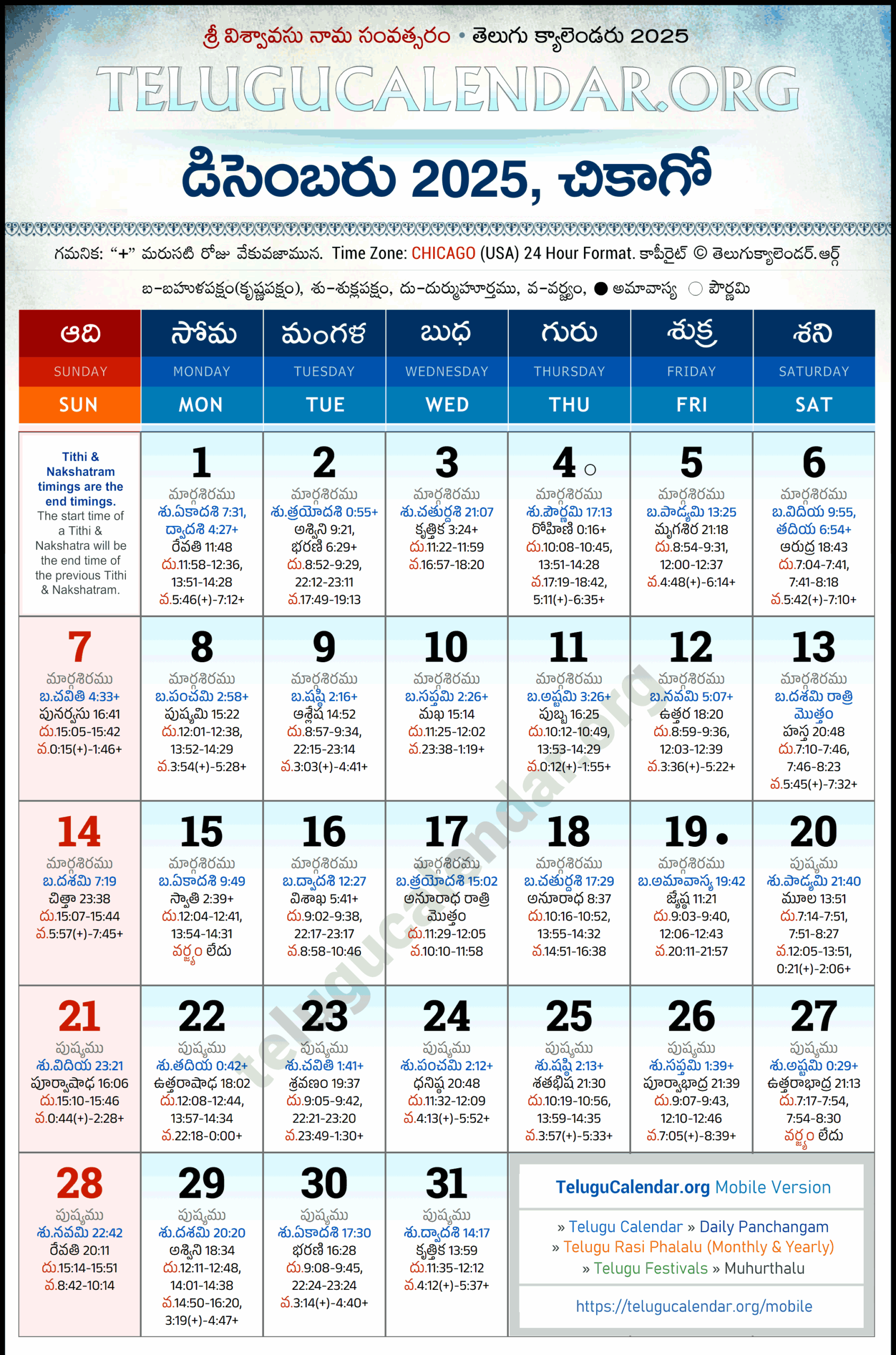 Chicago Telugu Calendar 2025 December PDF Festivals