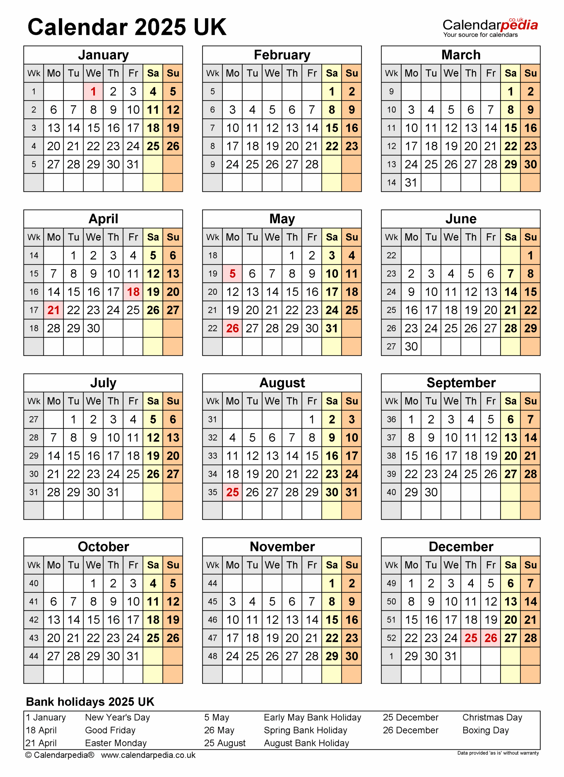 Calendar 2025 UK With Bank Holidays And PDF Excel Word Templates