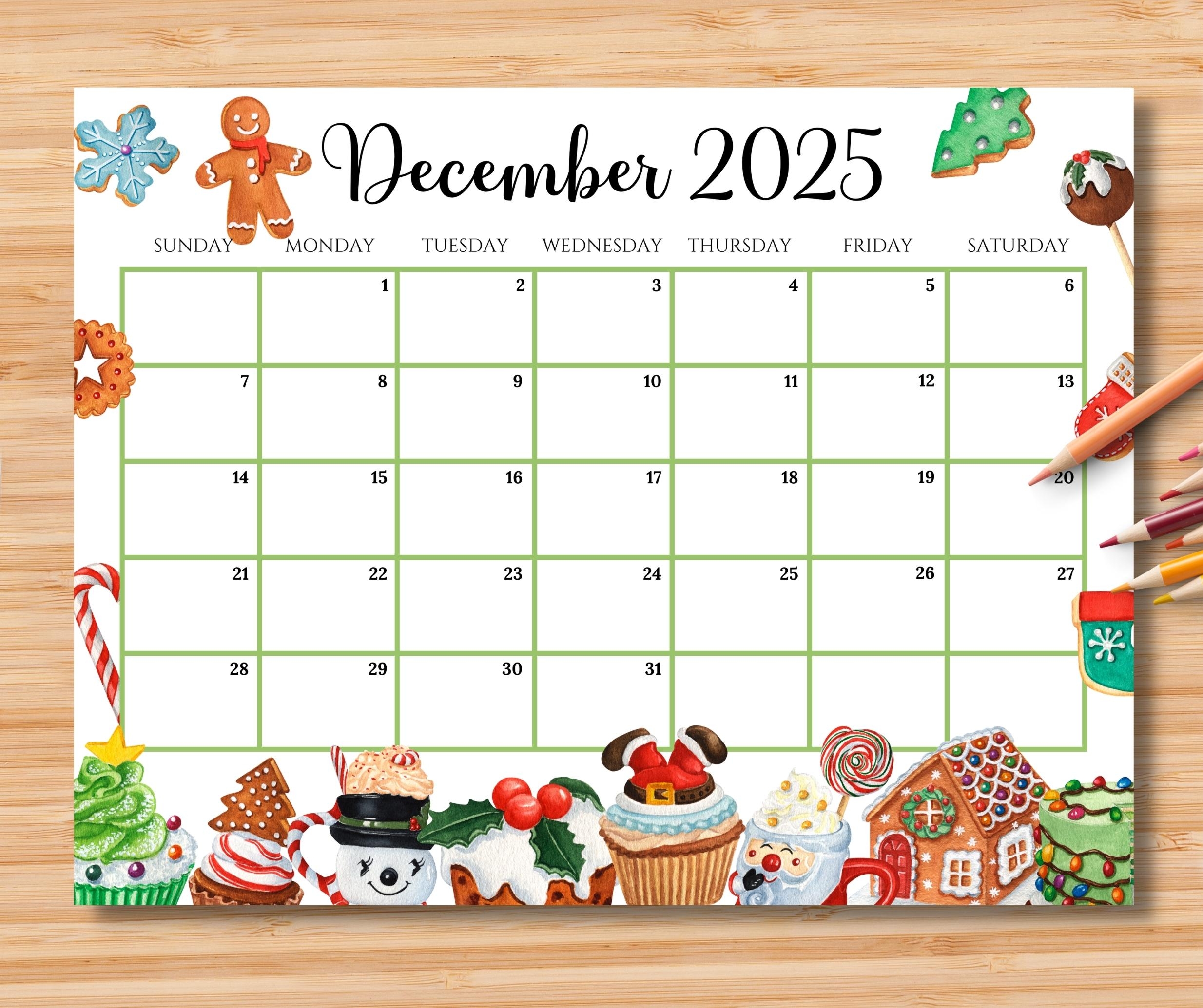 EDITABLE December 2025 Calendar Colorful Christmas W Sweets