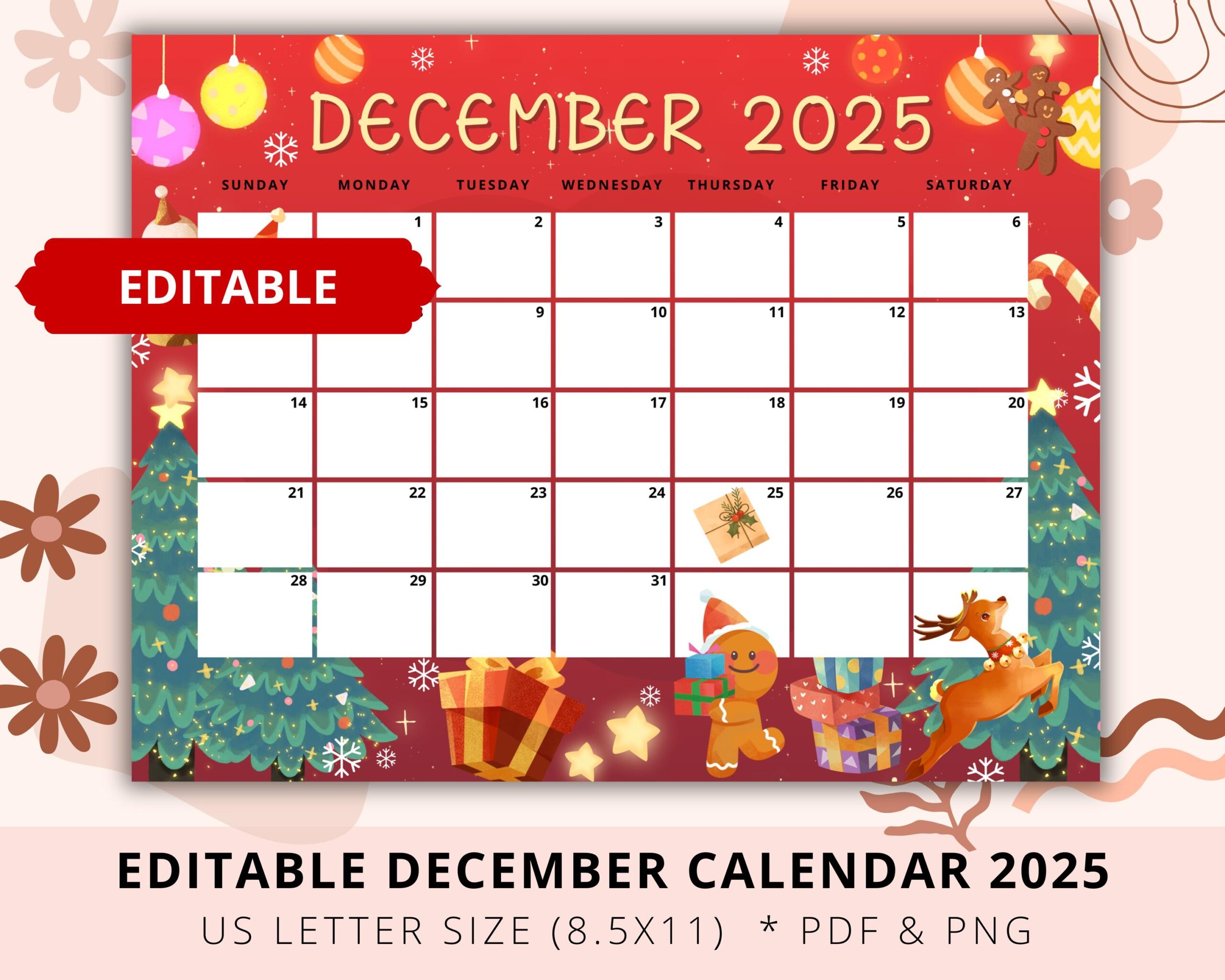 Editable Christmas Calendar 2025 December 2025 Planner December 2025 Christmas Holiday Red Theme Christmas Planner Download PDF Etsy
