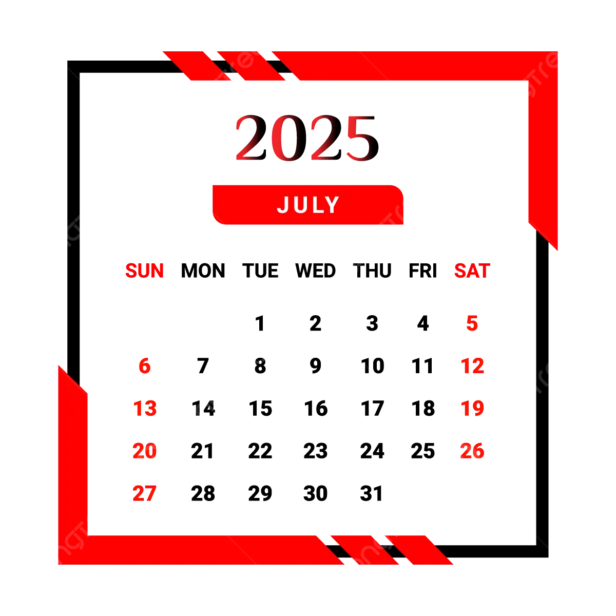 2025 July Month Calendar With Red And Black Unique Style Vector Monthly Calendar Calendar July 2025 PNG And Vector With Transparent Background For Free Download