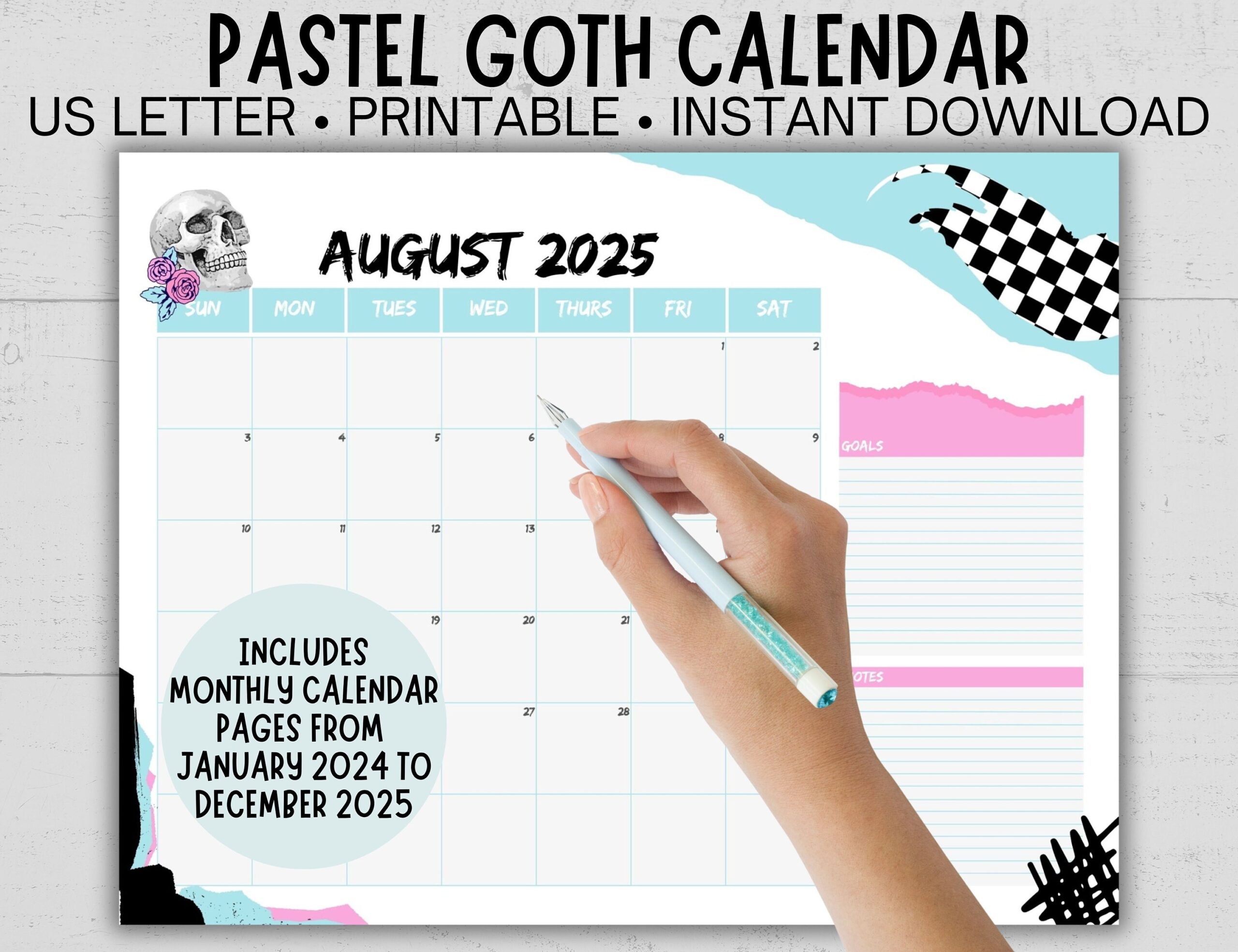 Printable Emo Punk 2024 2025 Calendar Skull Monthly Calendar Perpetual Calendar Pastel Goth Design Year At A Glance Included Etsy