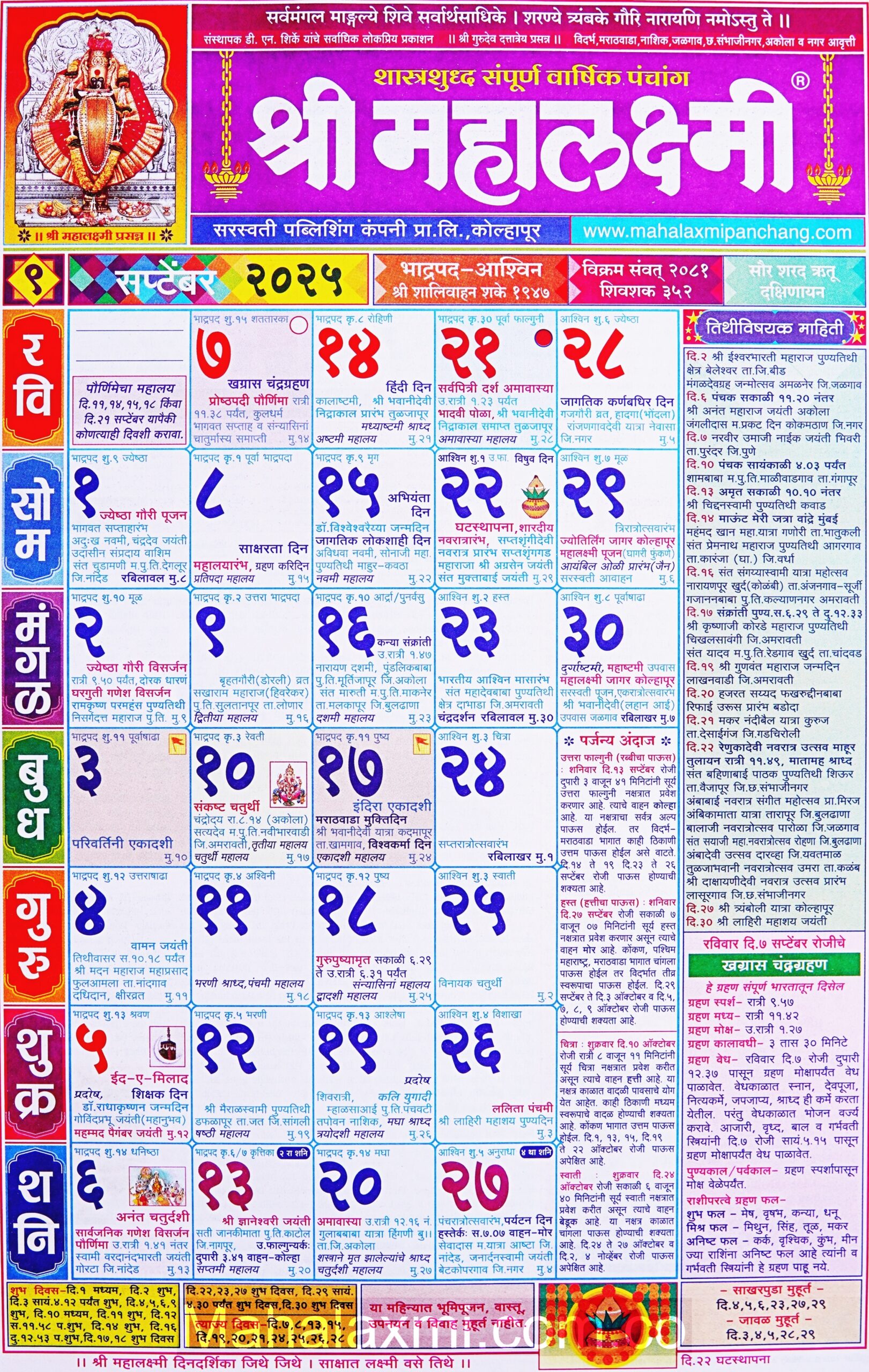 Mahalaxmi Calendar September 2025