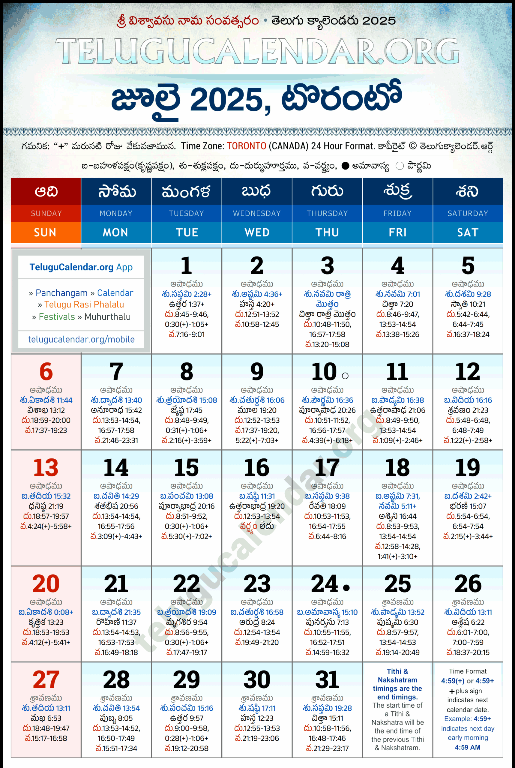 Toronto Telugu Calendar 2025 July PDF Festivals