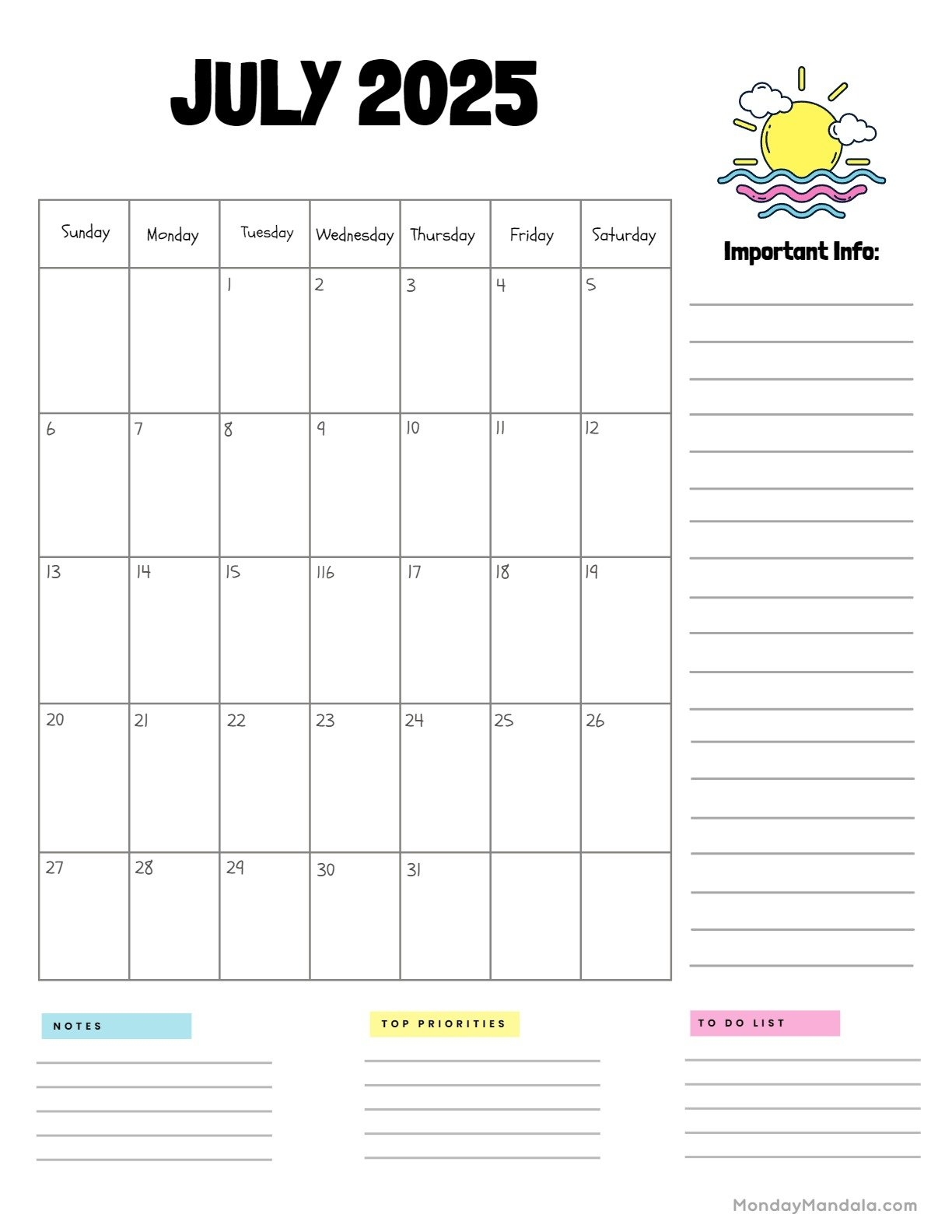 Our July 2025 calendar features plenty of space for you to write down notes, reminders, and to-do lists. With a clean and simple design, it’s easy to read and customize to suit your needs. Simply download, print, and start planning your month ahead!