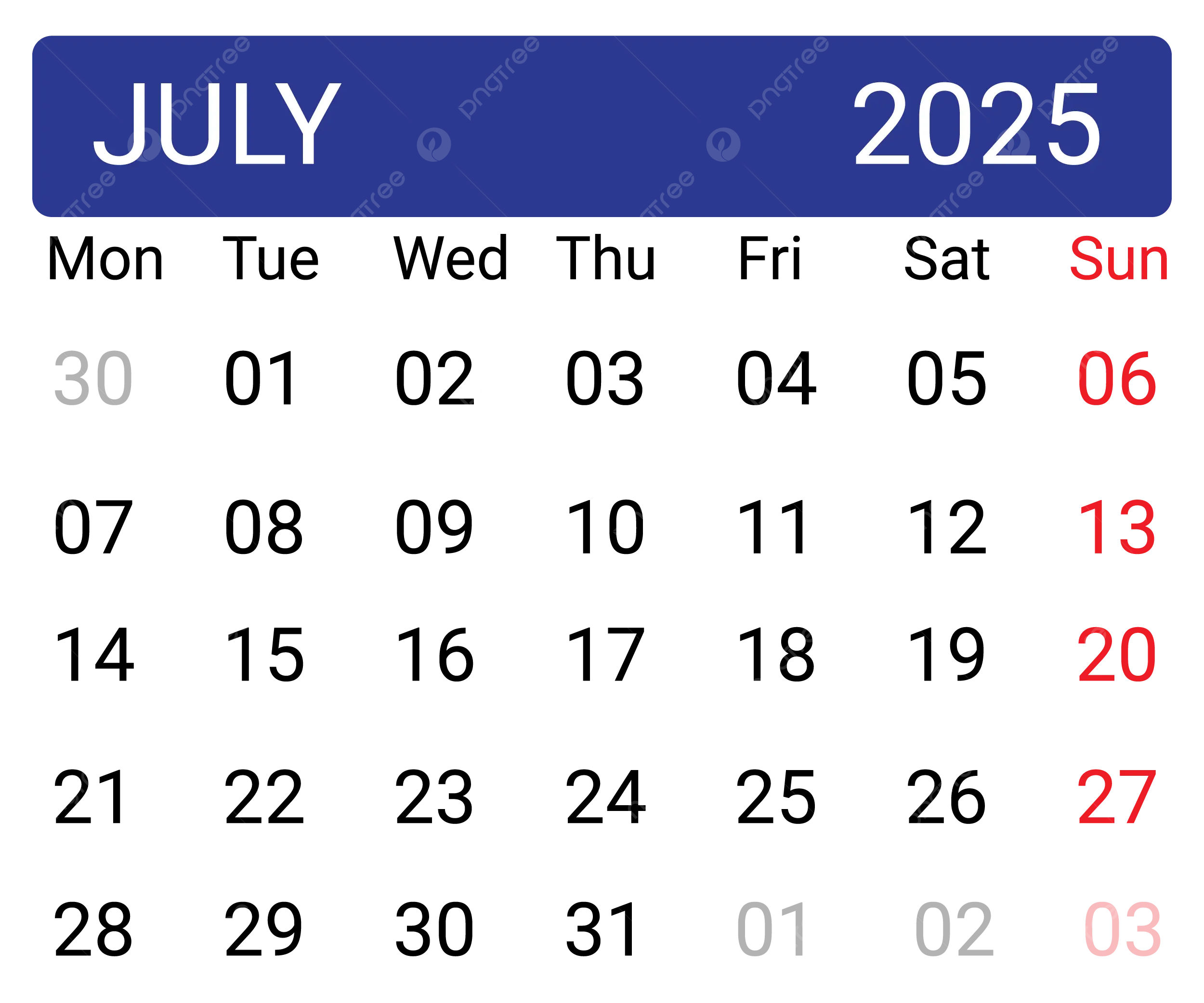 July 2025 Calendar Elegant Vector July 2025 July 2025 Calendar Calendar 2025 PNG And Vector With Transparent Background For Free Download