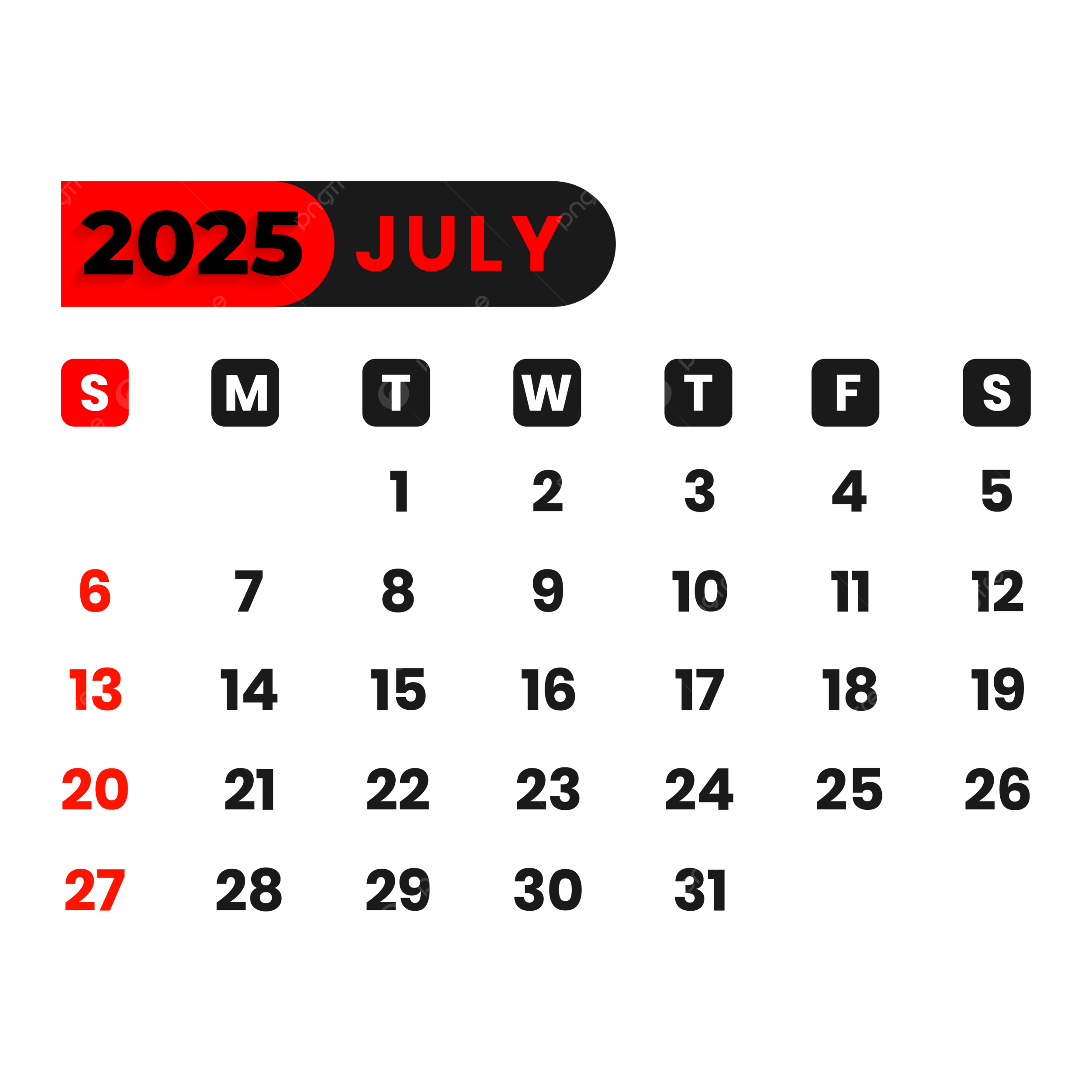 Calendar July 2025 Vector Calendar July 2025 July 2025 Calendar 2025 PNG And Vector With Transparent Background For Free Download