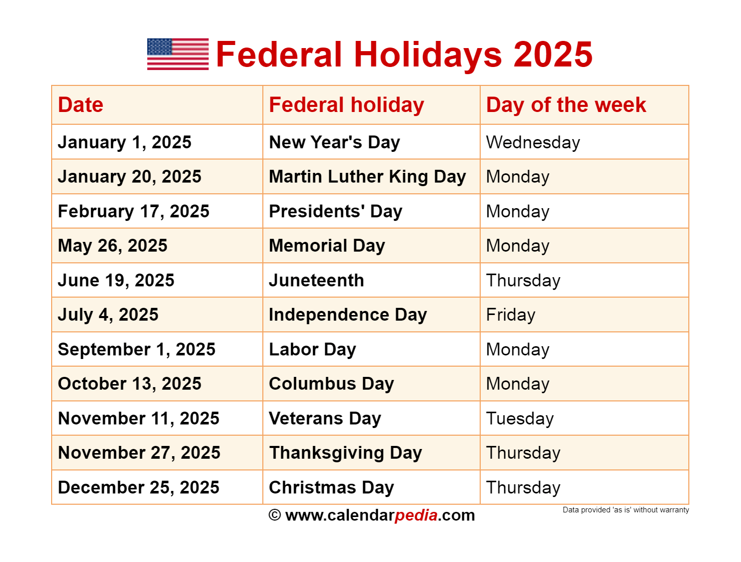 List Of Federal Holidays 2025 In The U S SaturdayGift