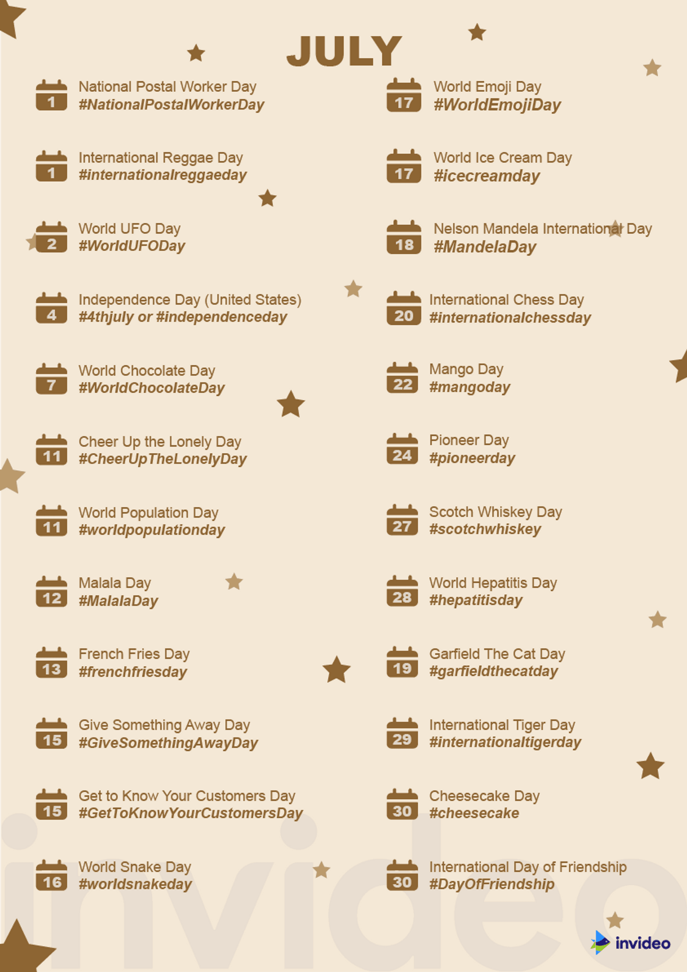 July is packed with exciting events and holidays that you can leverage to create engaging content for your audience. From Independence Day celebrations to National Ice Cream Day, there are plenty of opportunities to connect with your followers.