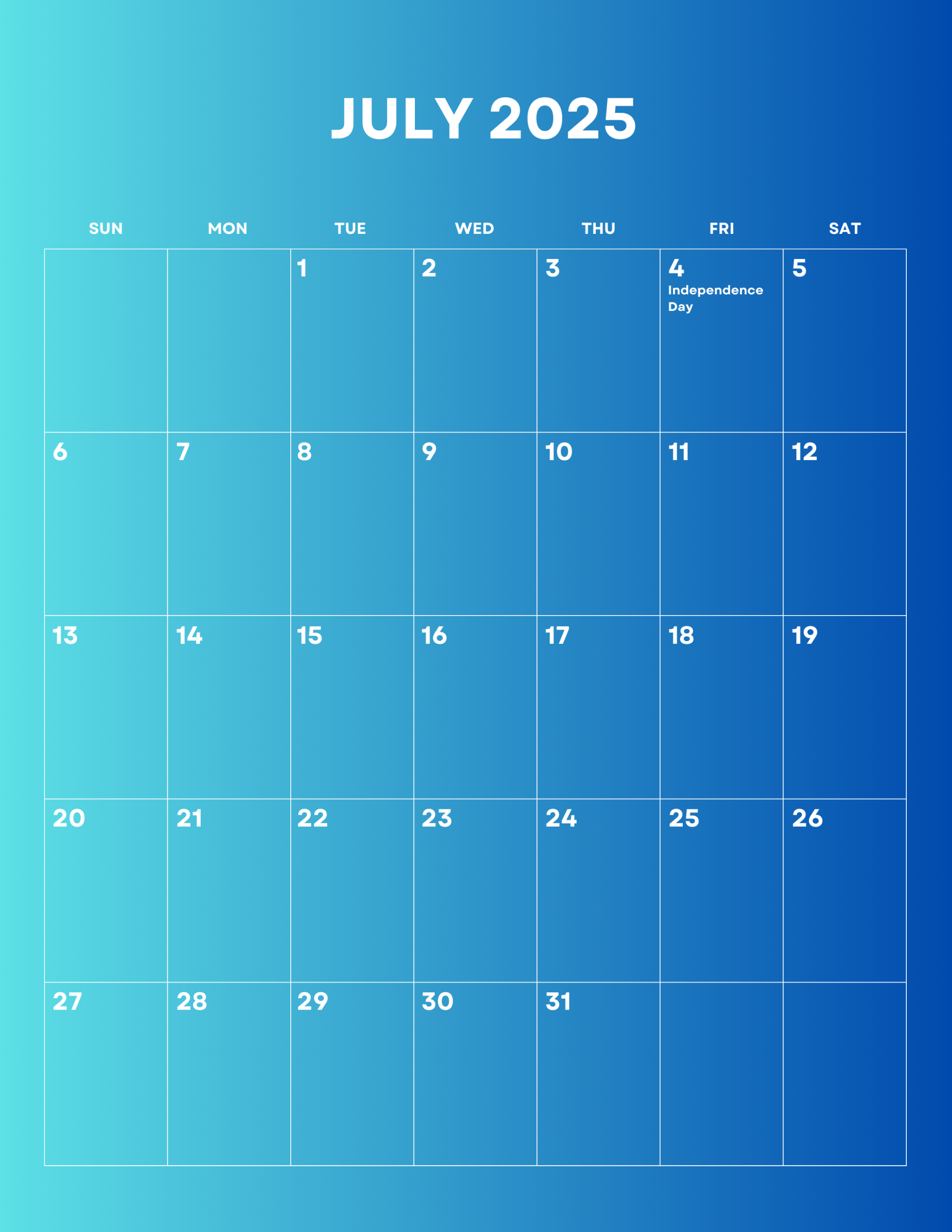 Calendar 2025 July Complete Vector Of National Holidays 2025