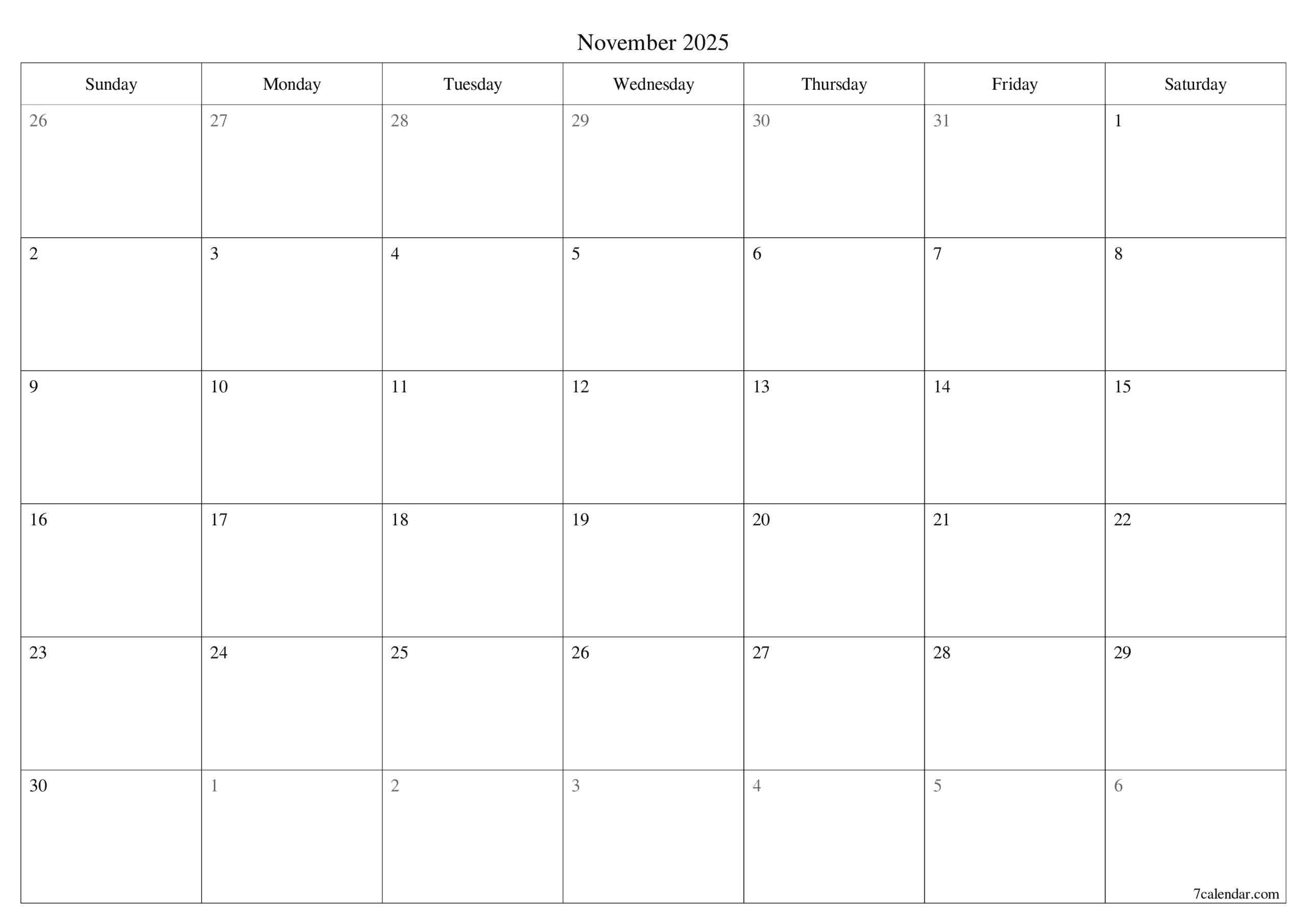 November 2025 Monthly Calendar Printable Free Brown Sunday