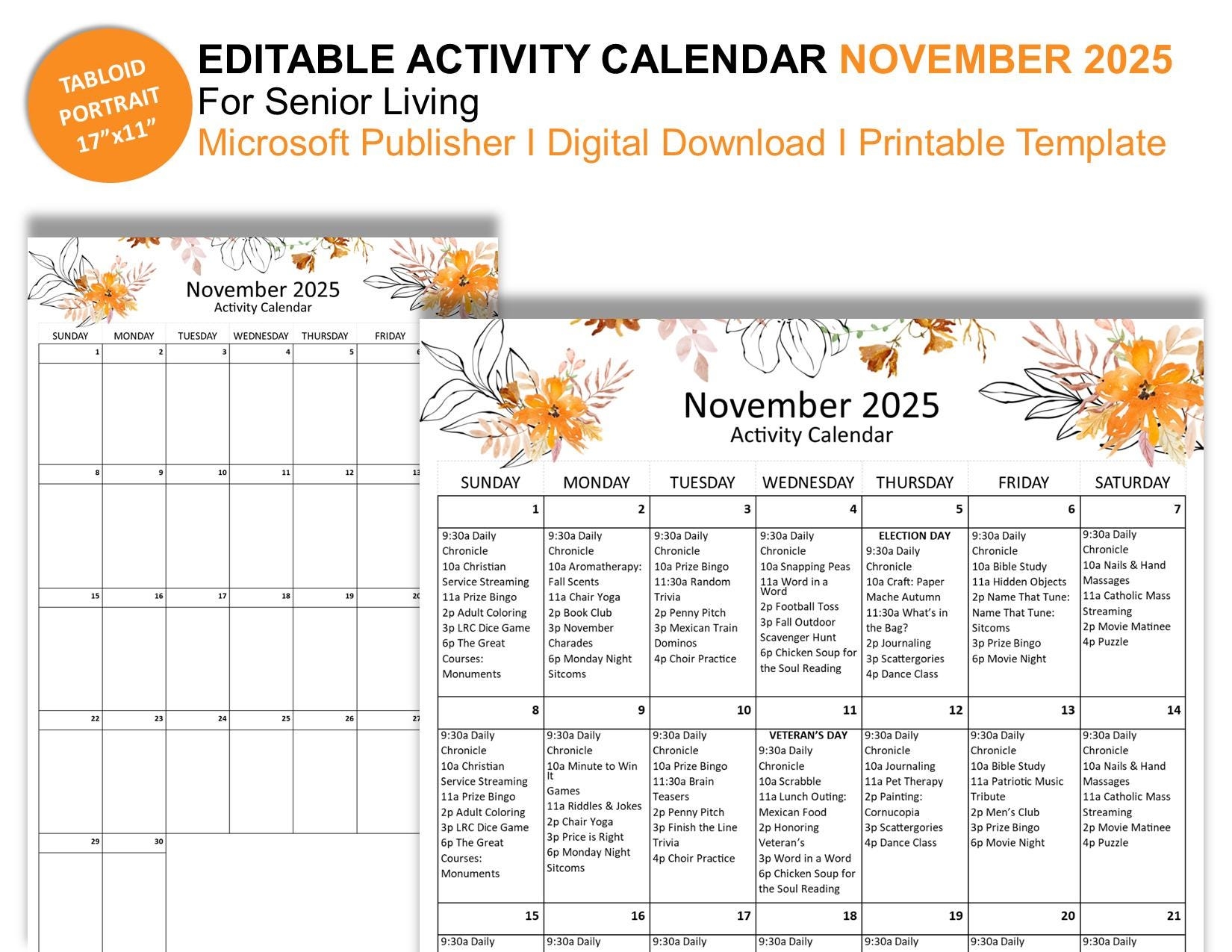 November 2025 Editable Monthly Activities Calendar For Senior Living Tabloid Size 17