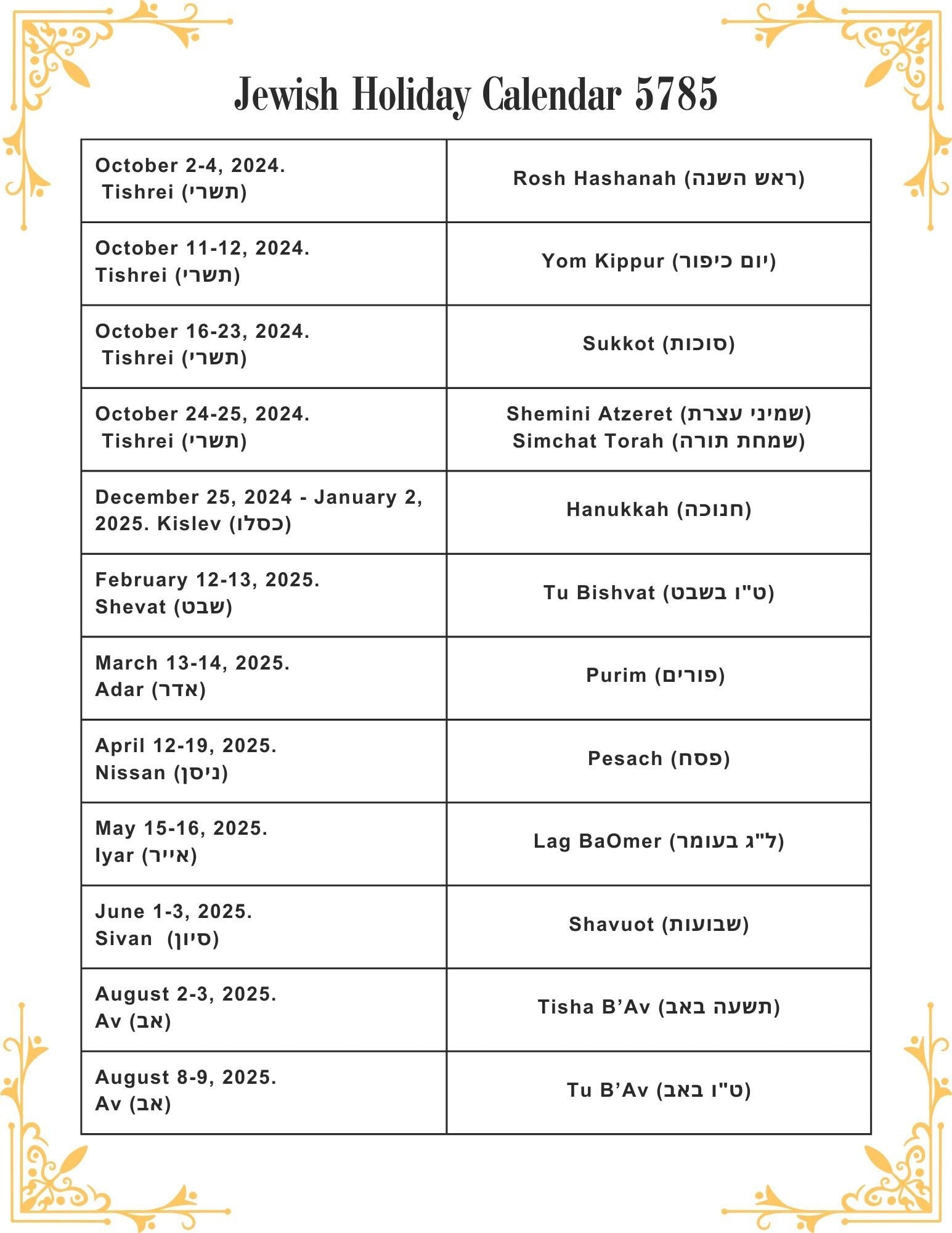 Jewish Calendar 2024 2025 PDF Templates With Jewish Holidays Lists