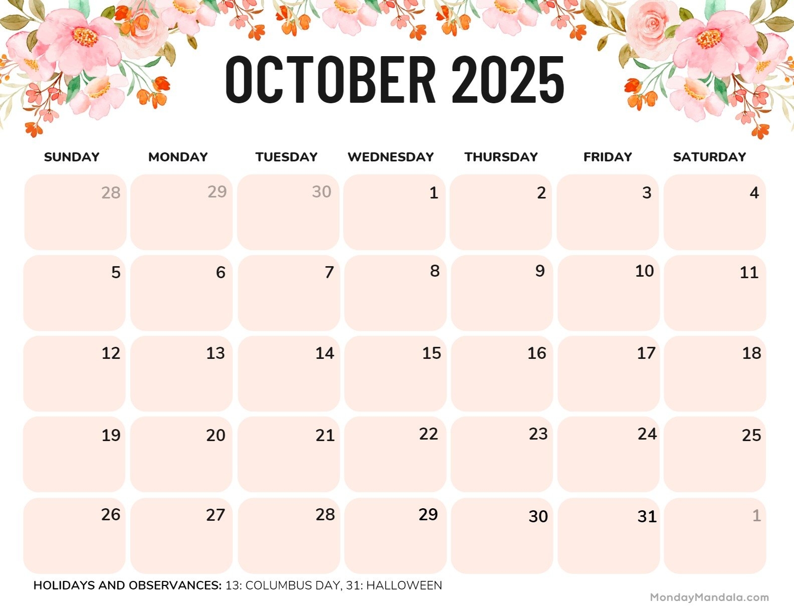 Free October 2025 Calendar Printable PDF XLS PNG Formats