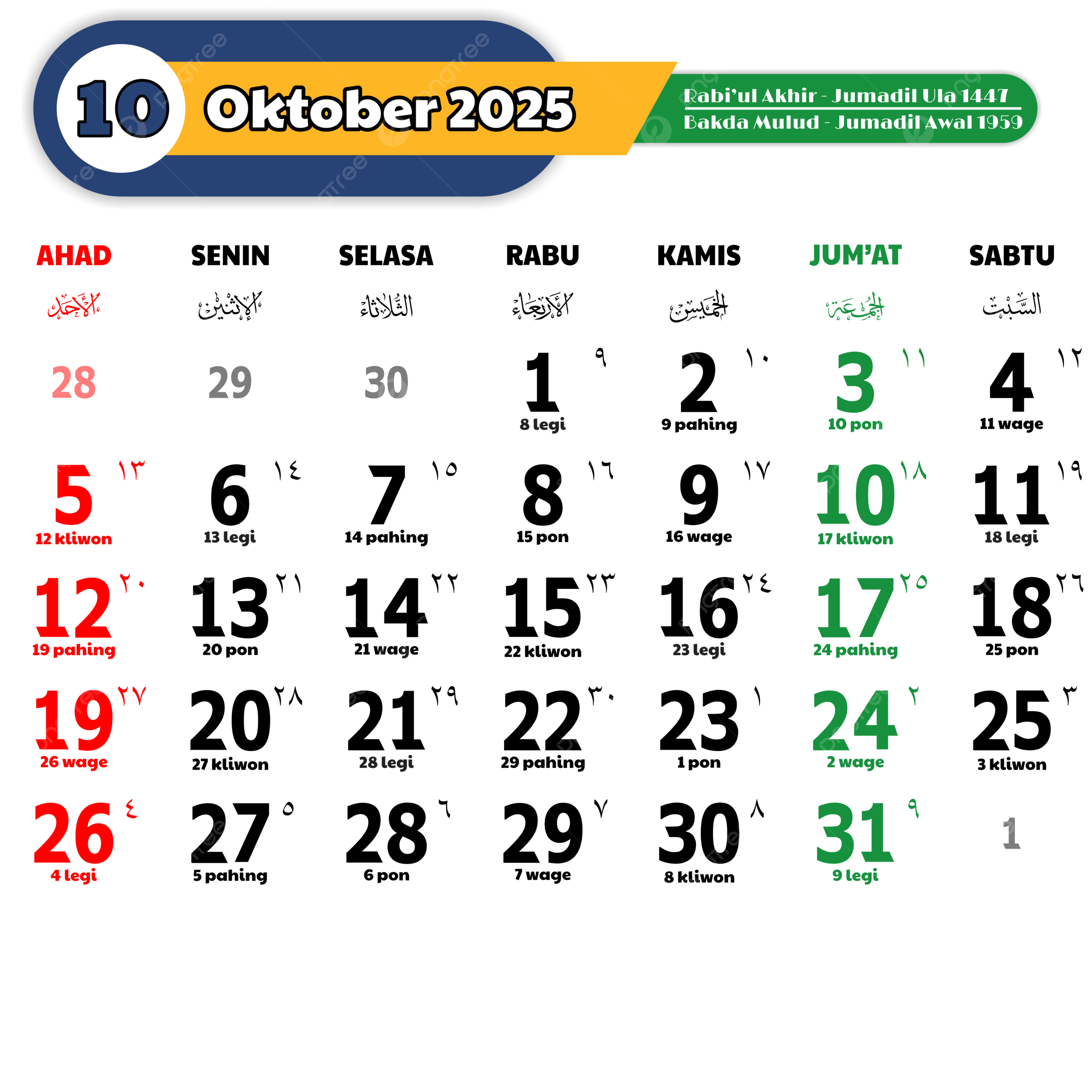 October 2025 Complete Indonesian Calendar In Green Vector 2025 Calendar Indonesian Calendar October PNG And Vector With Transparent Background For Free Download