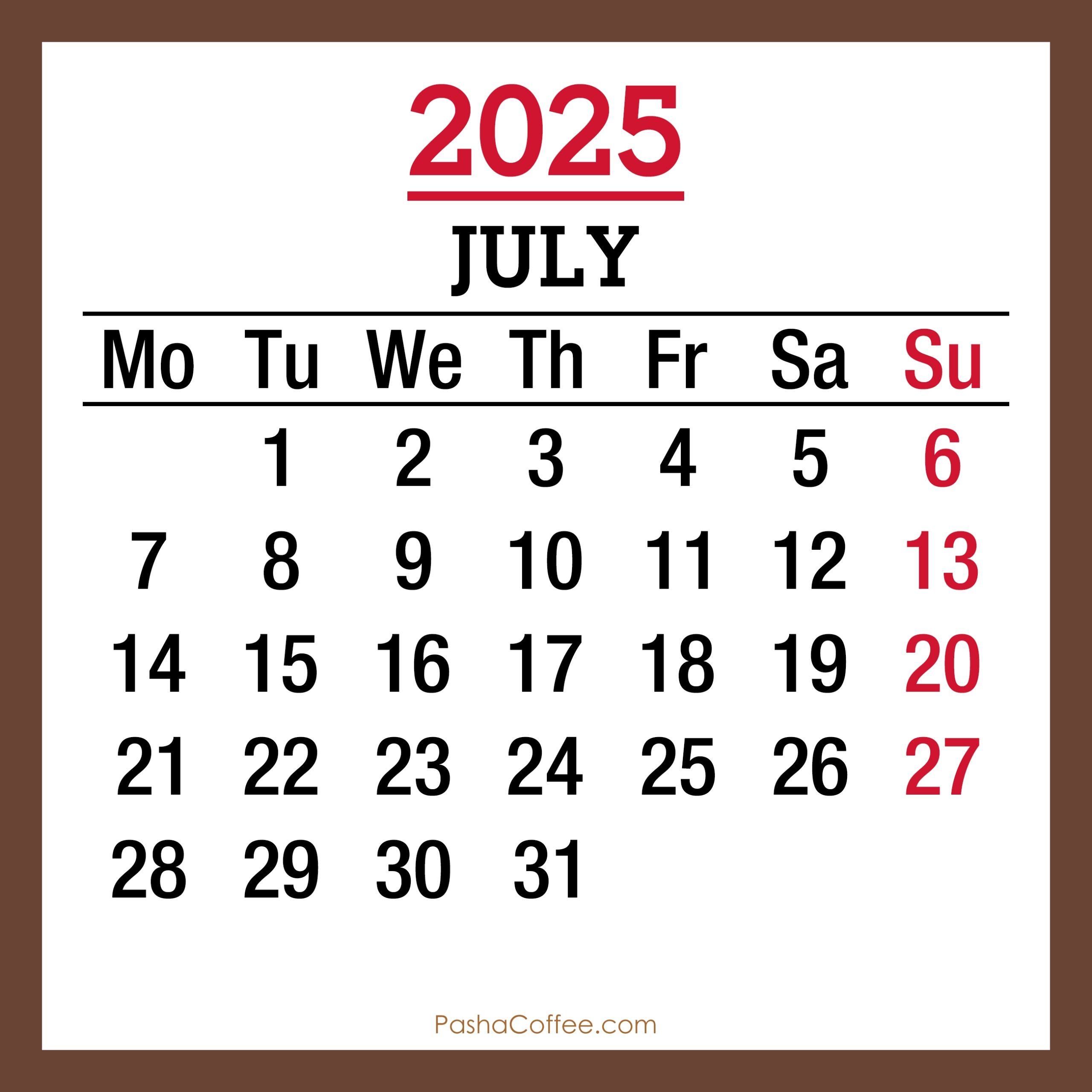 July 2025 Monthly Calendar Printable Free Brown Monday Start