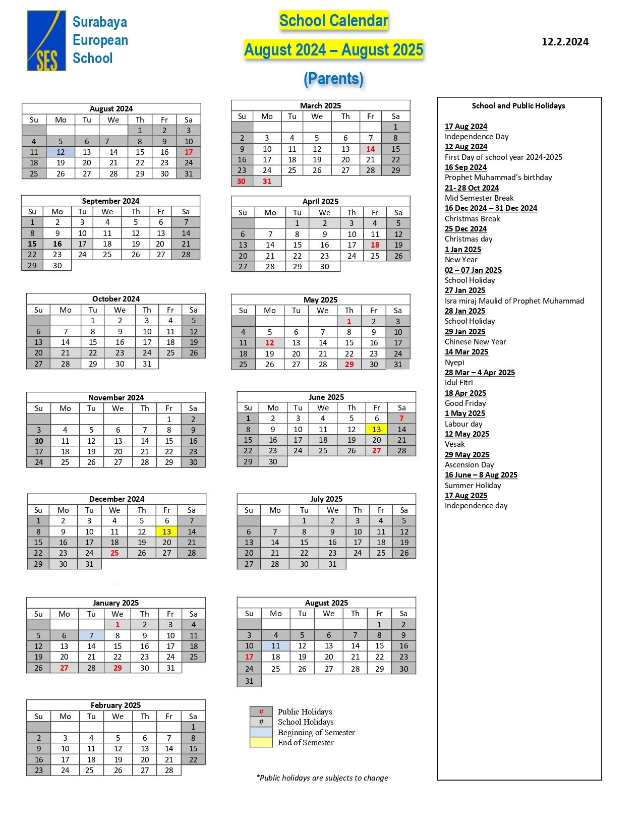 Calendar 2024 2025 Surabaya European School