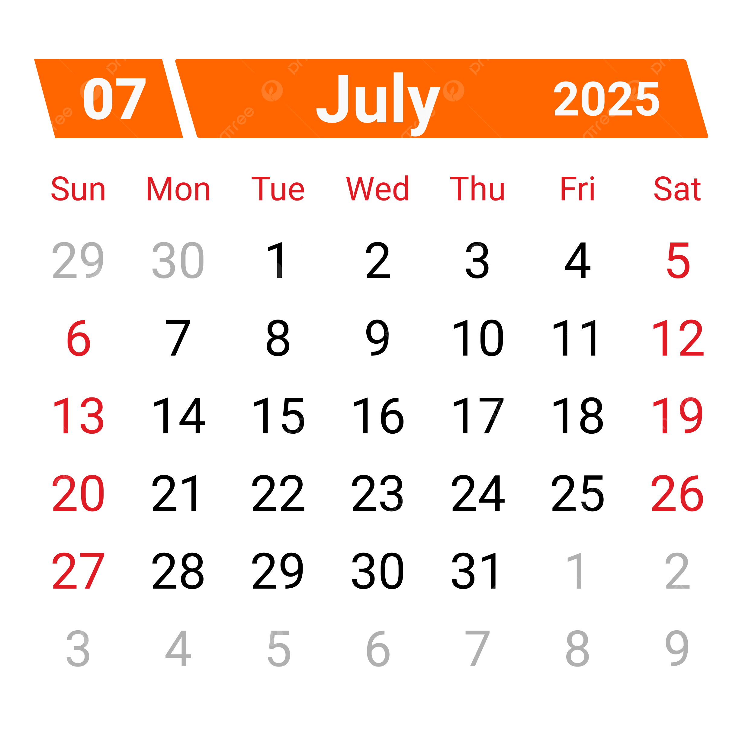 Monthly Calendar July 2025 Clipart Vector Monthly Calendar July 2025 Calendar 2025 PNG And Vector With Transparent Background For Free Download