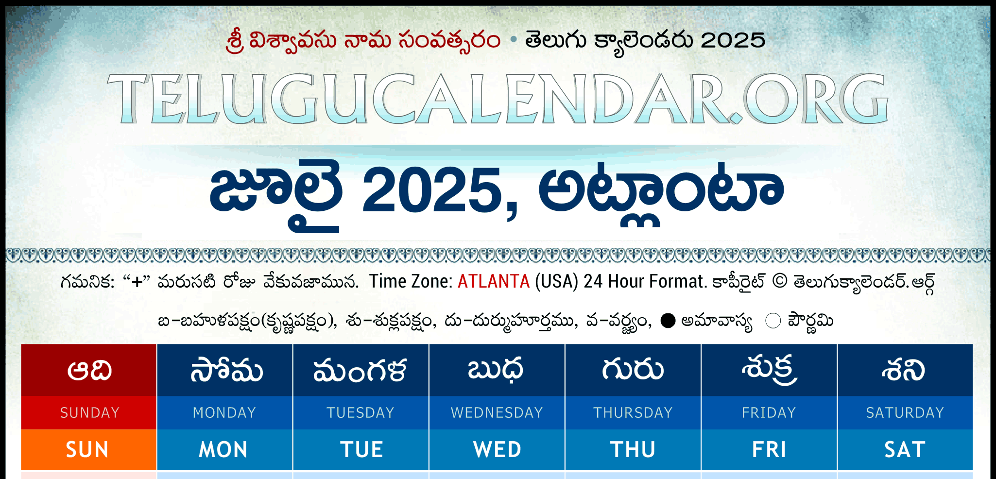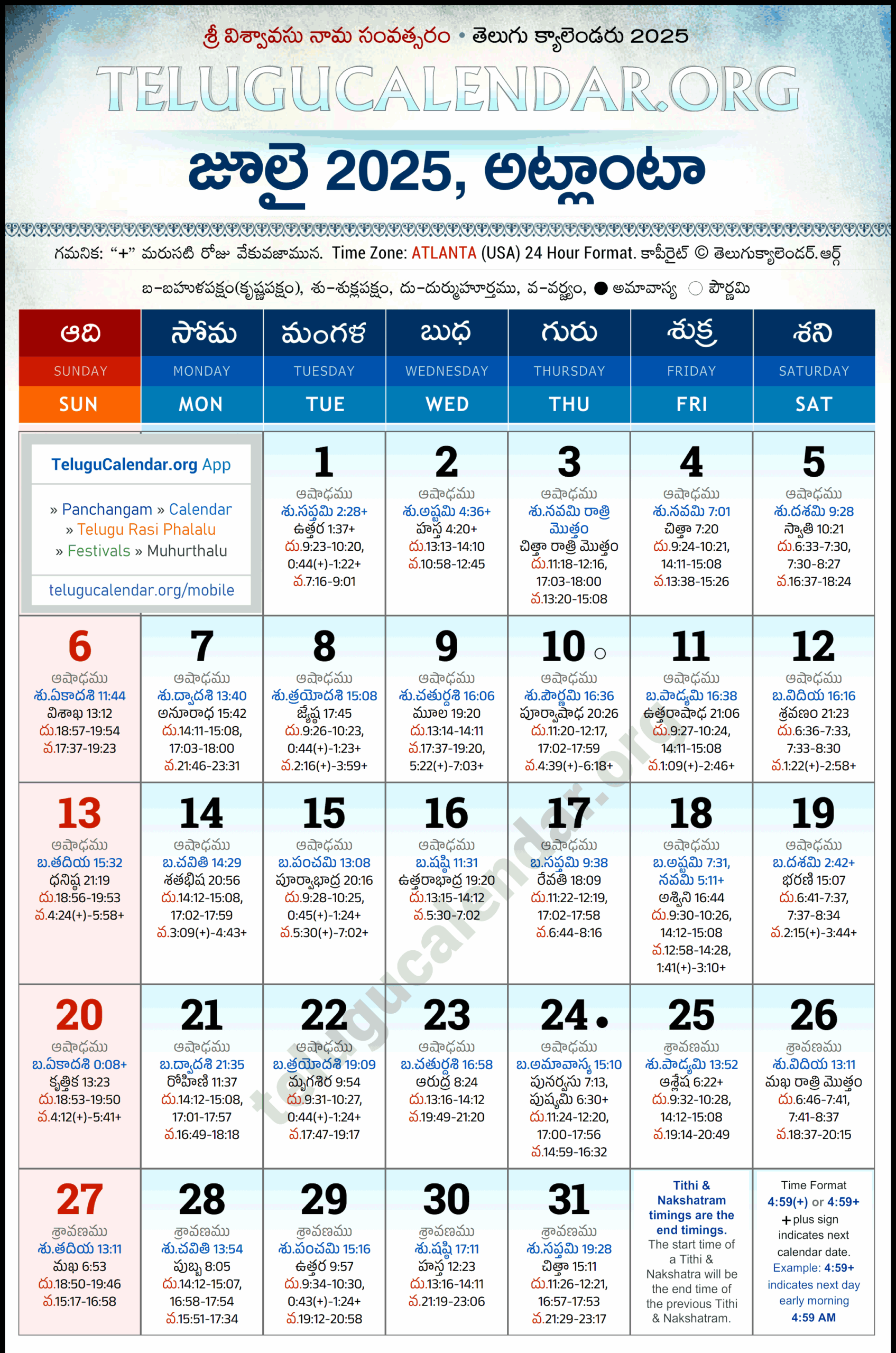 Whether you’re celebrating a birthday, anniversary, or a religious festival, the Telugu Calendar for July 2025 in Atlanta will ensure you never miss a special occasion. Stay informed and organized with this handy tool.