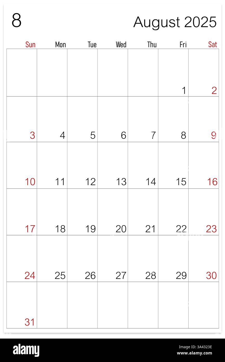 August 2025 Calendar Vertical Template On White Background Stock Photo Alamy